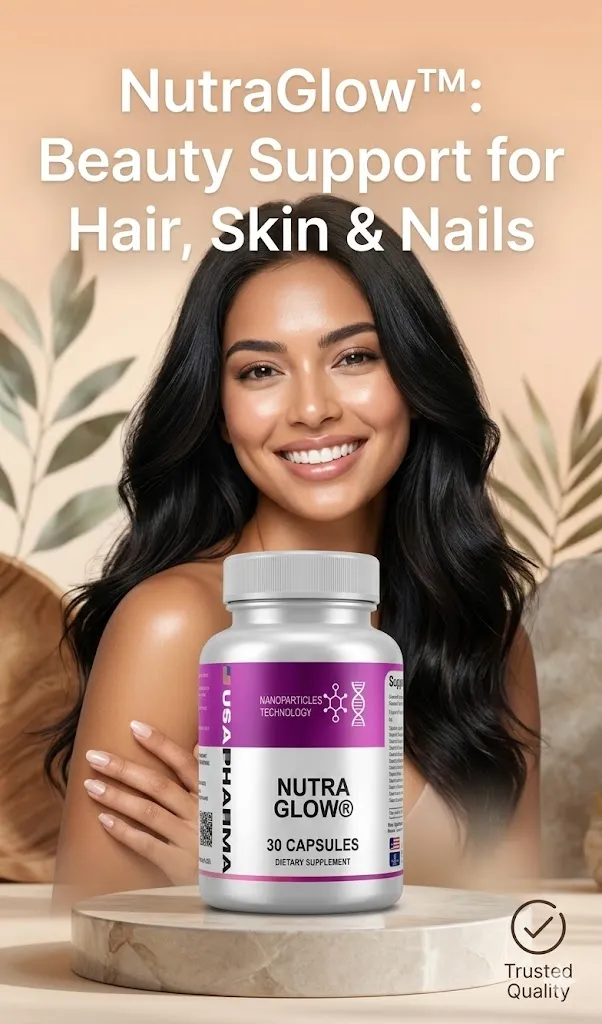 NutraGlow is a premium beauty supplement featuring biotin, collagen, and antioxidants. It supports healthy hair growth, glowing skin, and stronger nails. Made in the USA, it bridges nutritional gaps effortlessly.